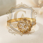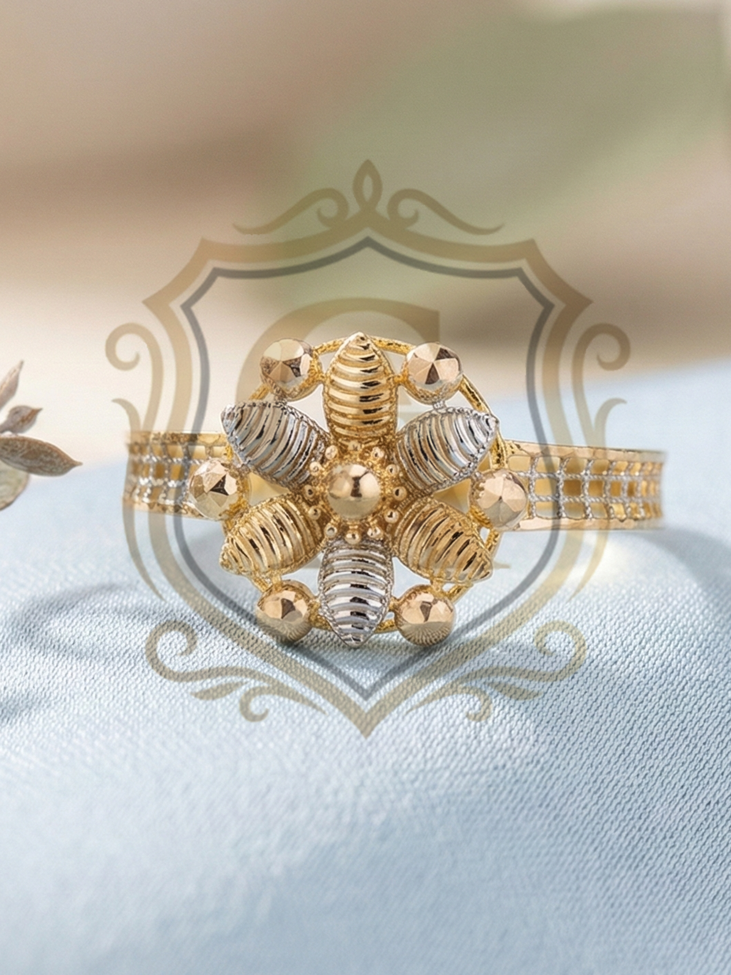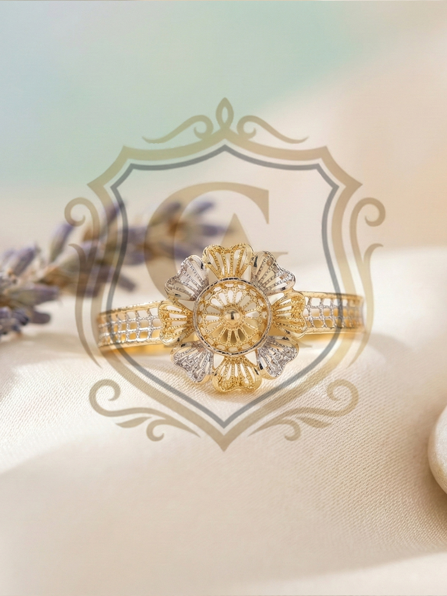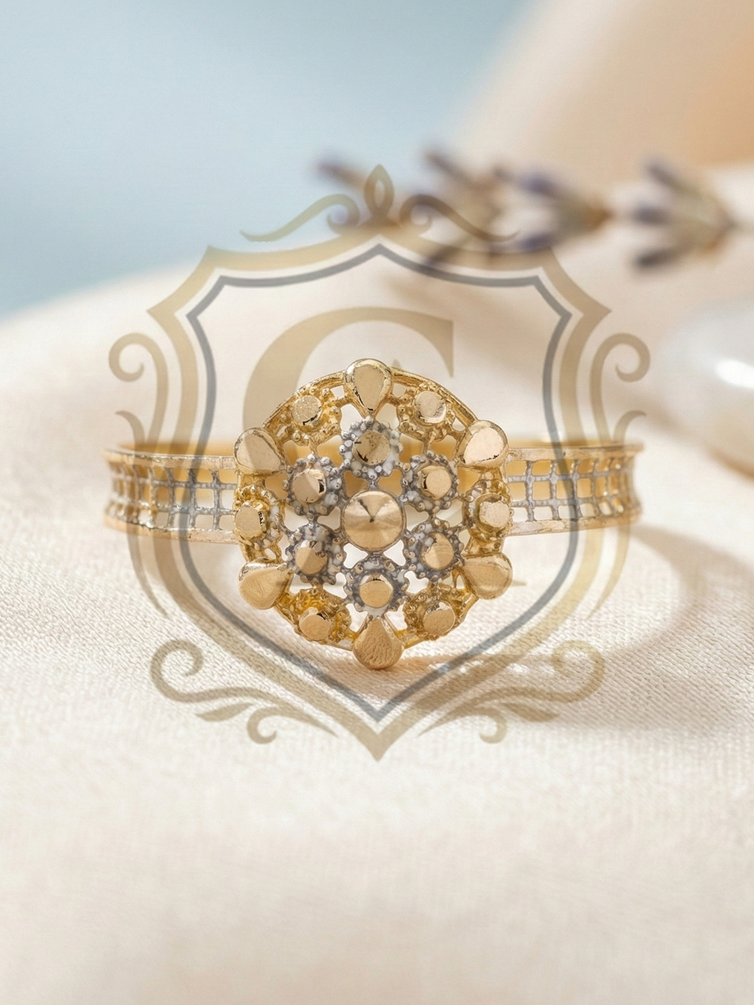 Features: Intricate floral motif, polished gold band, lightweight and comfortable