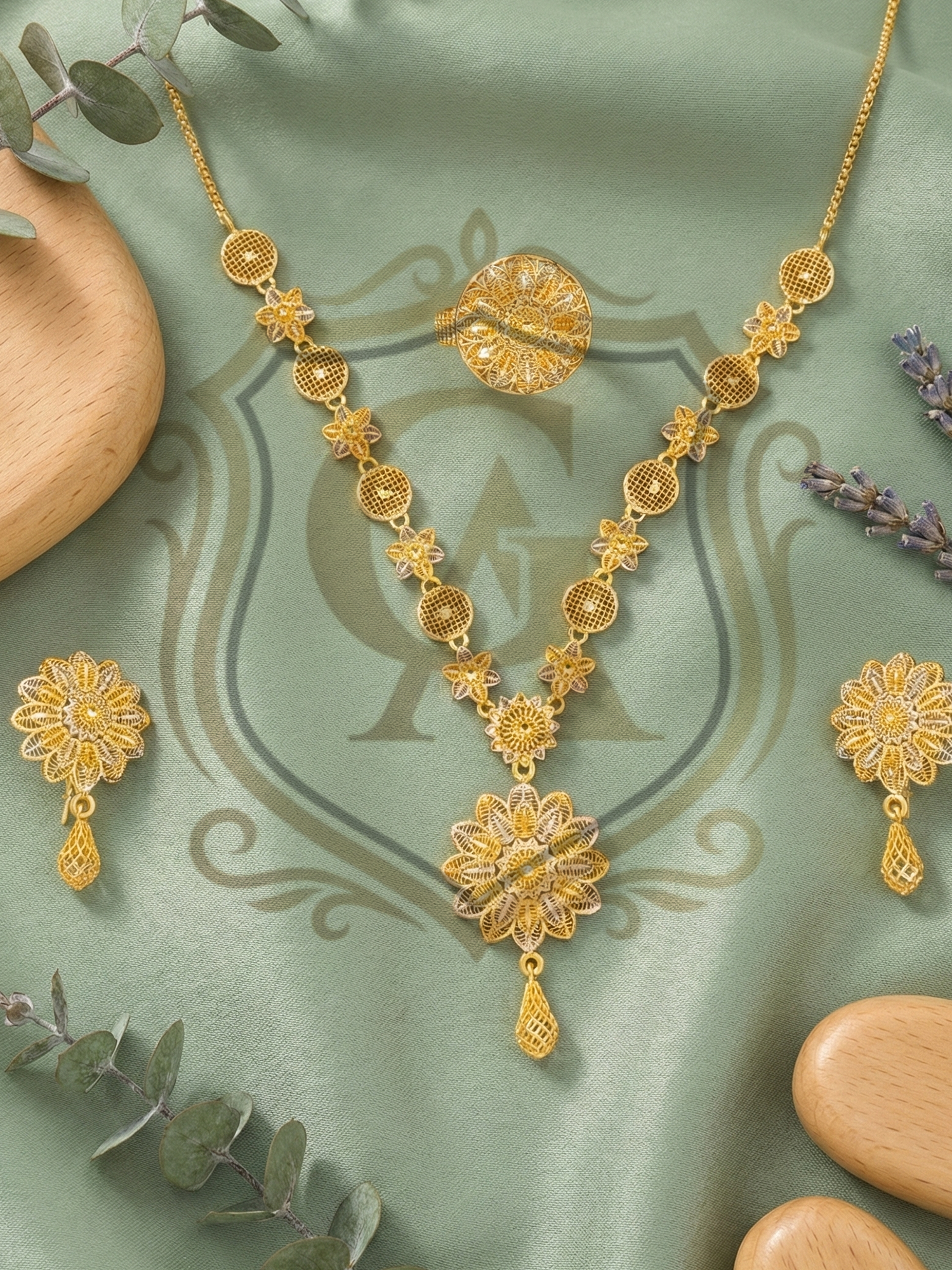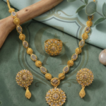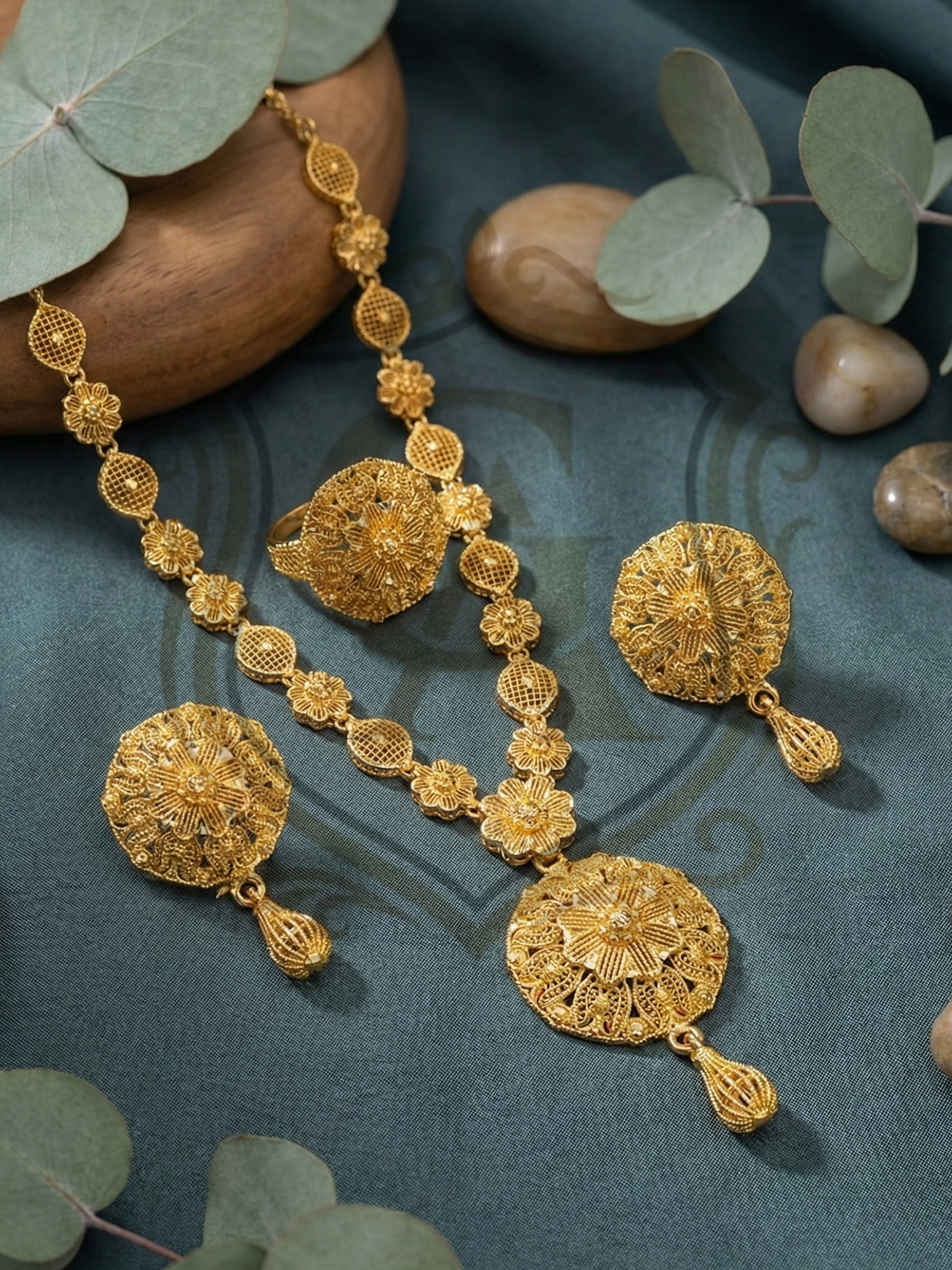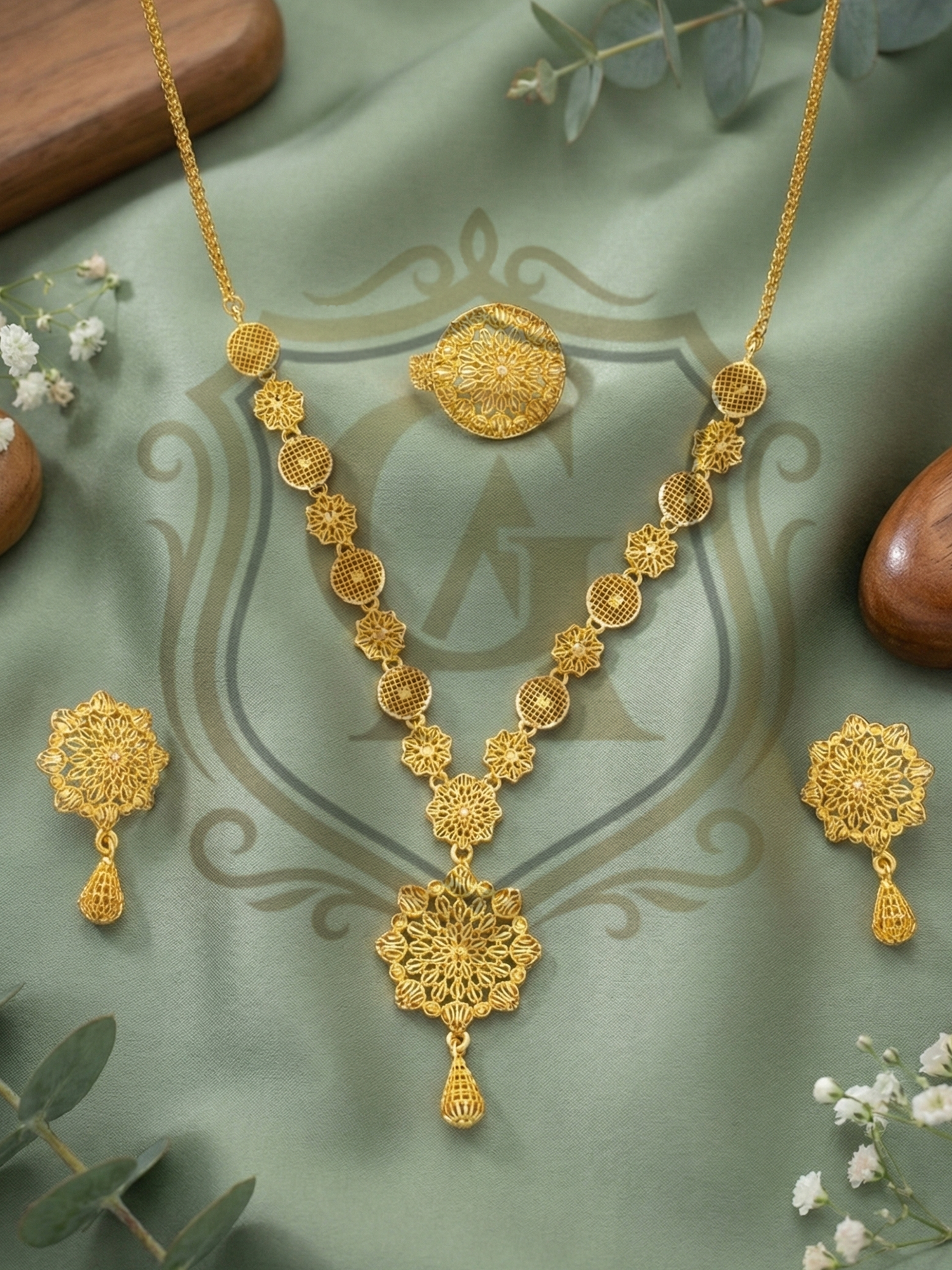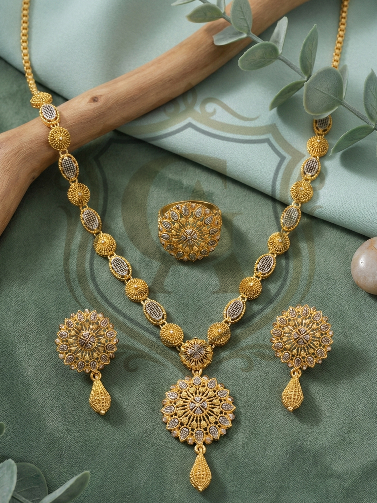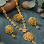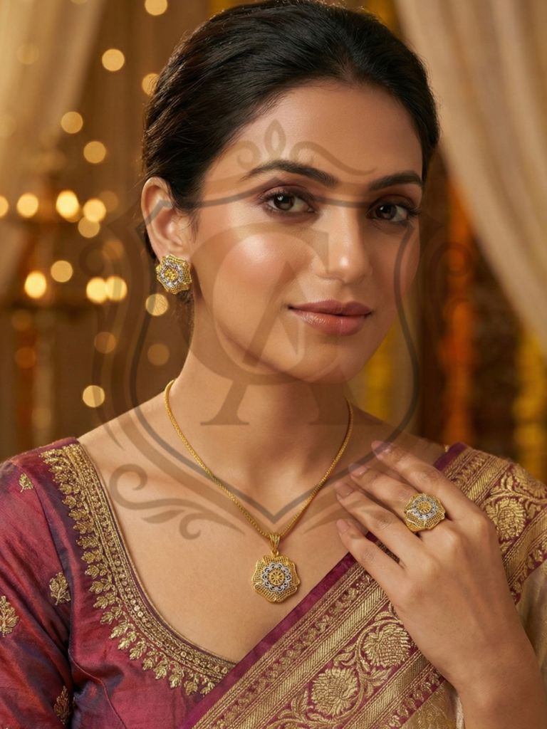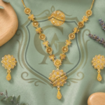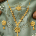 A timeless masterpiece featuring a “Single Lari” (single strand) design that leads to a magnificent, oversized floral pendant. The necklace showcases intricate filigree meshwork, giving it a voluminous and royal appearance while remaining surprisingly lightweight. Accompanied by matching floral stud earrings and a bold statement ring, this set creates a sophisticated look perfect for formal gatherings and festive celebrations.