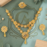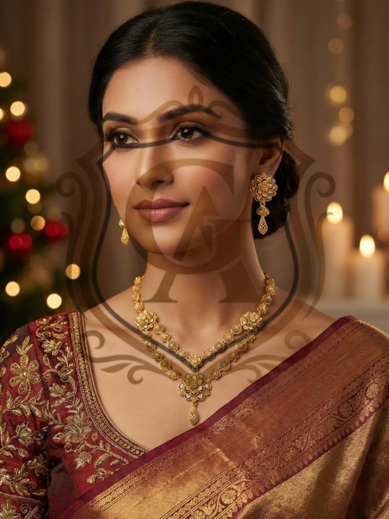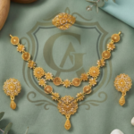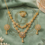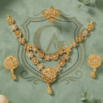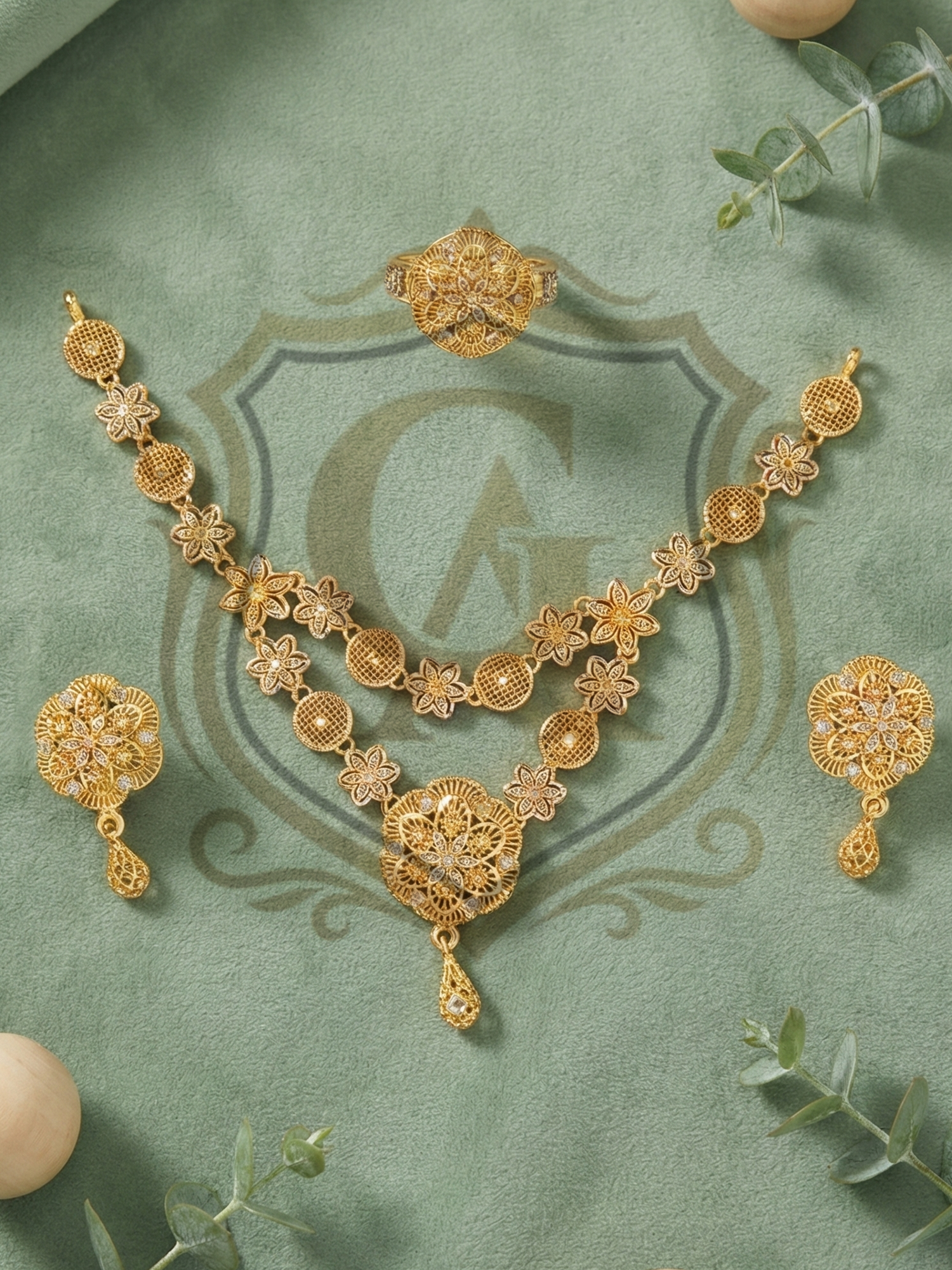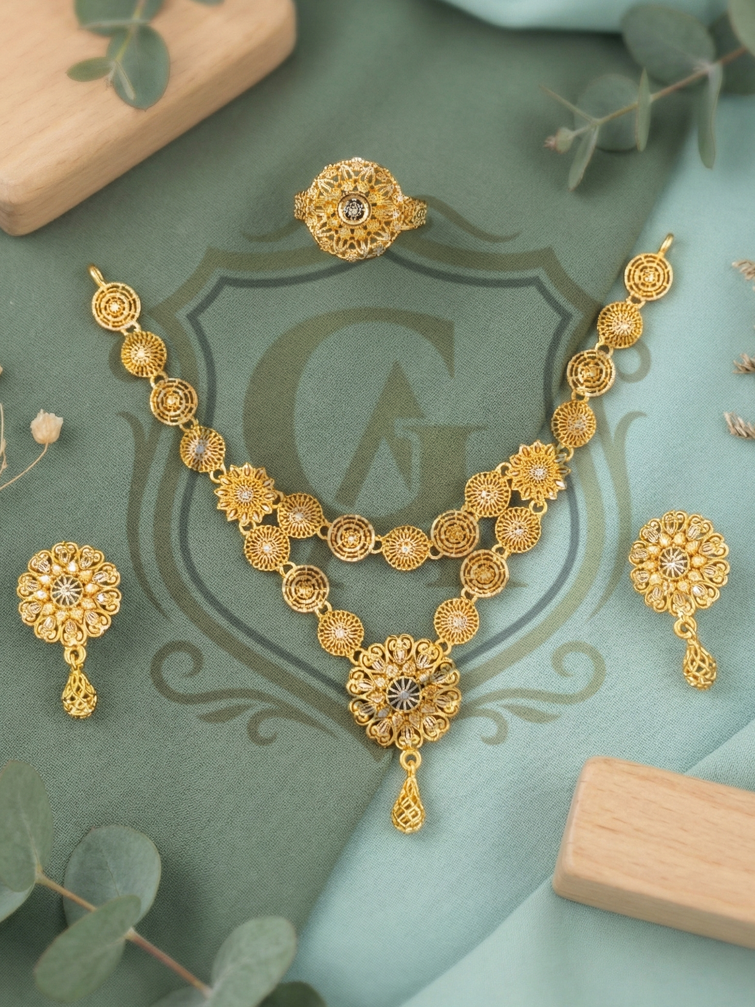 Radiate elegance with this exquisitely crafted gold jewelry set, featuring a delicate floral motif interlaced with intricate filigree lattice work. Designed for the modern woman who appreciates traditional artistry, this set offers a luxurious look without the heavy weight, making it perfect for long-duration wear at weddings, festivals, and parties. The set includes a stunning necklace, matching drop earrings, and a statement ring.