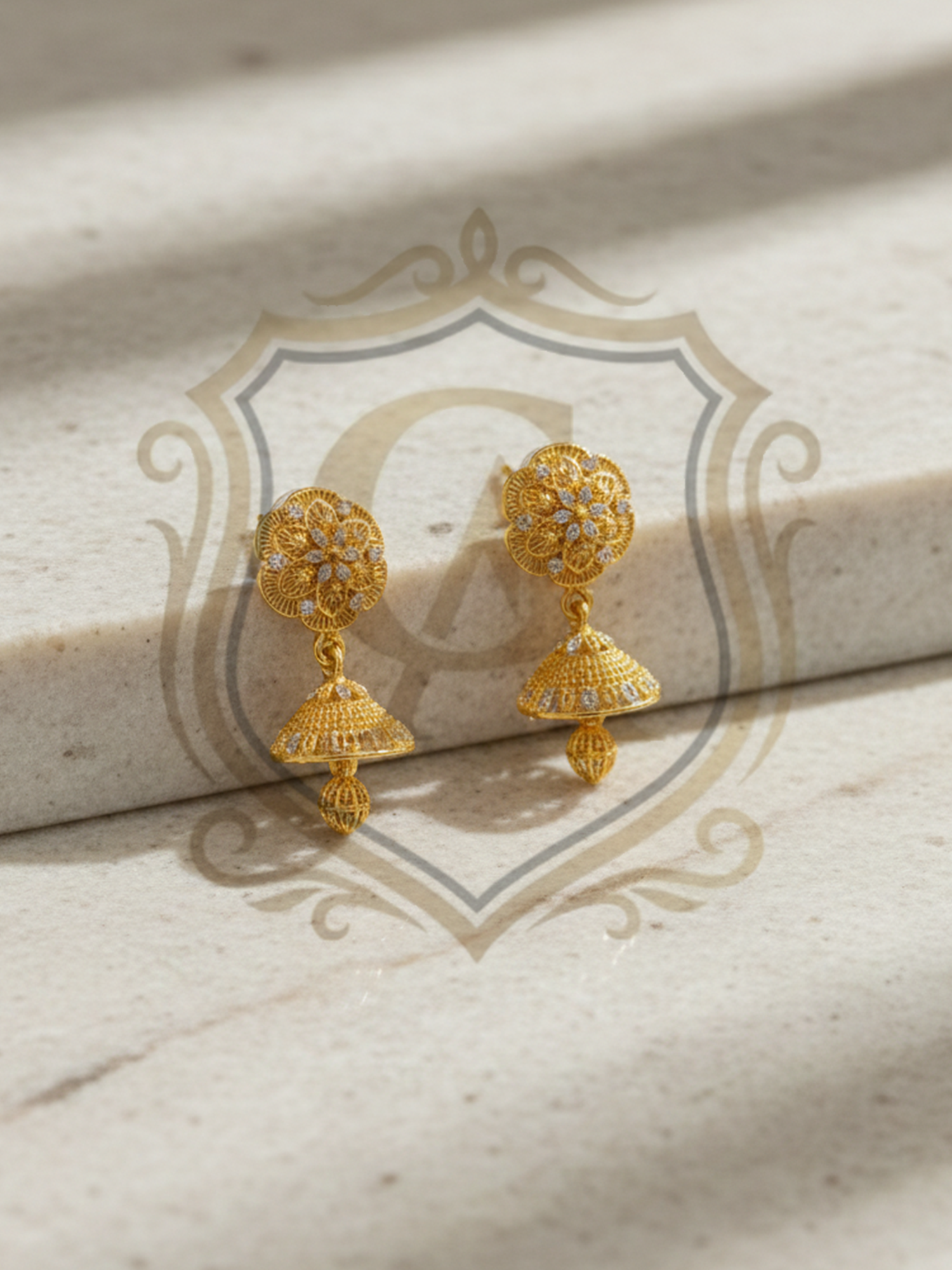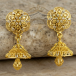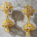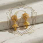 These elegant gold earrings feature intricate floral filigree work, paired with delicate dangling drops that create a graceful and timeless look. Perfect for festive wear, weddings, or elevating any special occasion outfit.