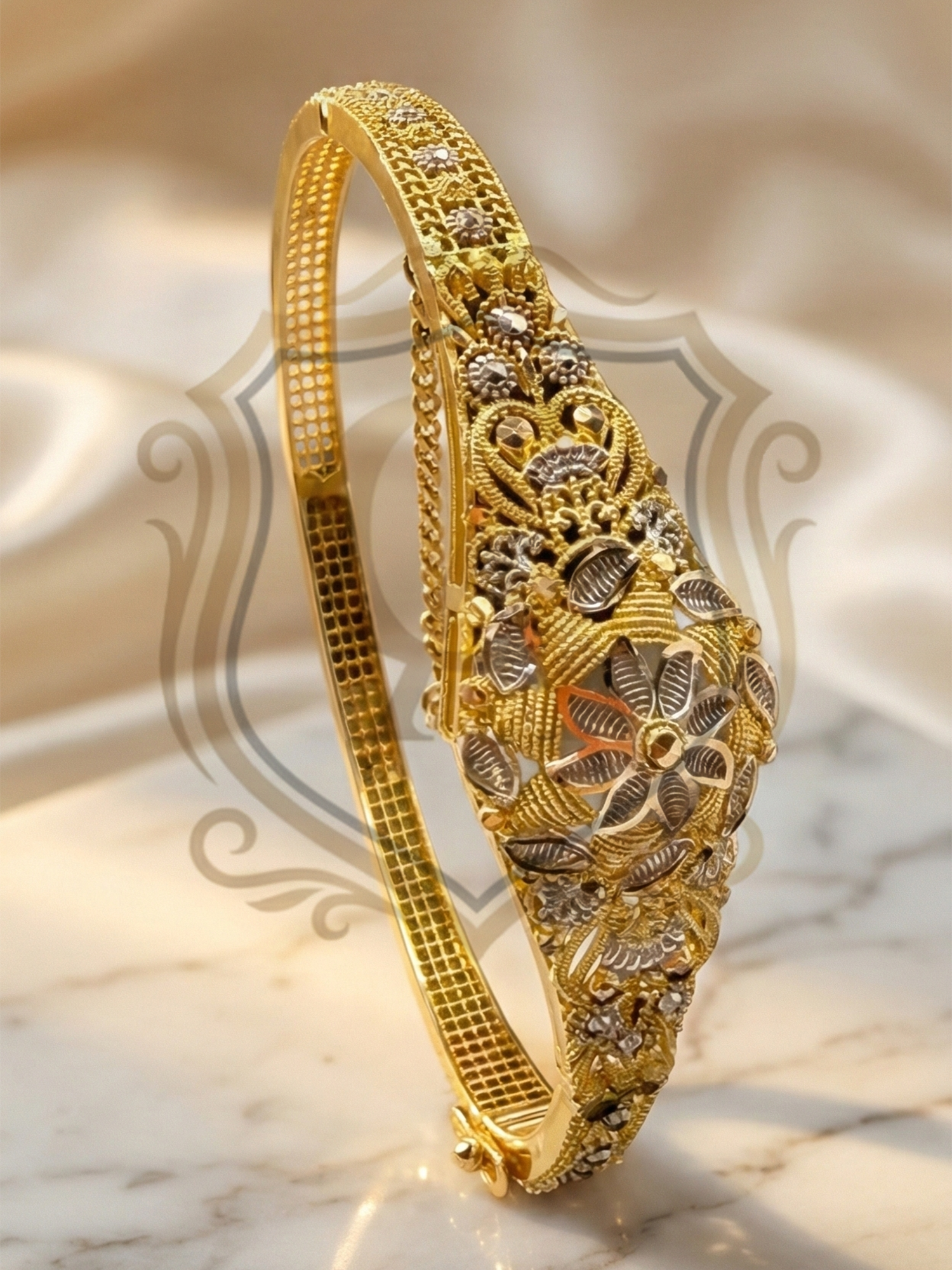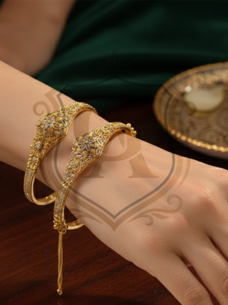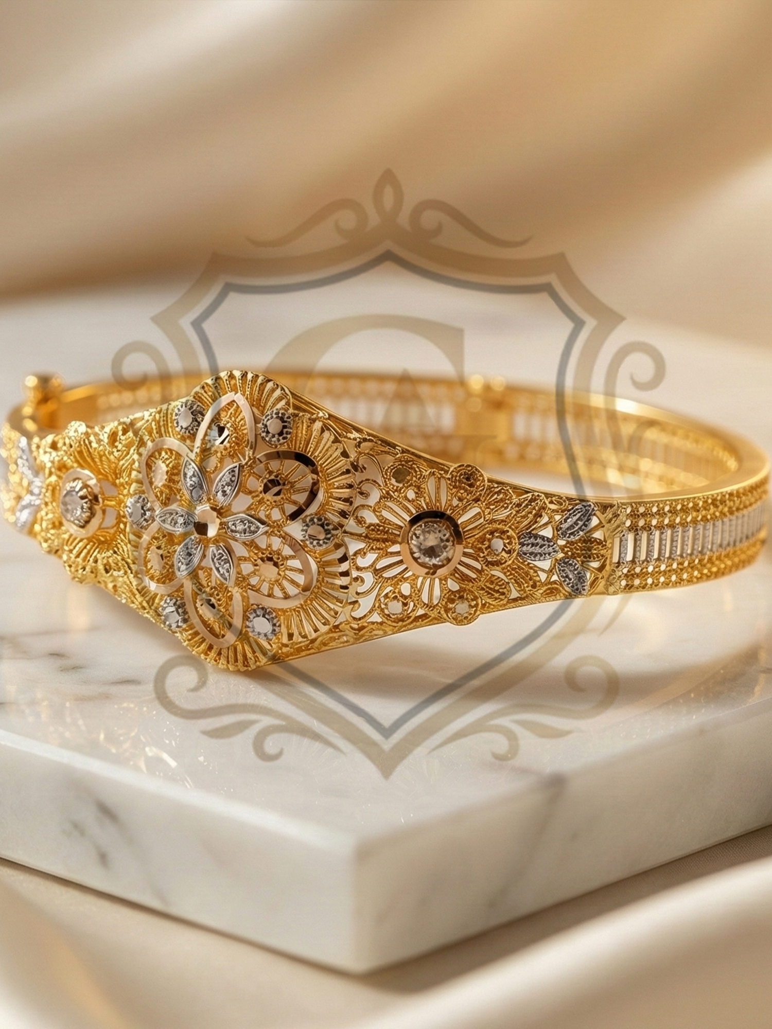 Add a touch of sophistication to your style with these stunning gold-plated designer bracelets. Featuring intricate detailing and a delicate floral design, these bracelets are a perfect blend of elegance and modern charm. Crafted with precision, they are ideal for both casual and formal occasions. Each bracelet weighs between 10 to 15 grams, offering a lightweight feel while exuding luxury. The exquisite craftsmanship ensures durability and long-lasting shine.