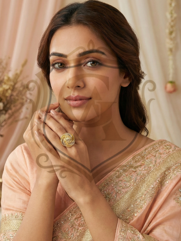 This radiant floral halo ring is crafted from premium 22K gold, featuring an elegant layered petal design with a shimmering central accent that enhances its brilliance. The textured circular frame adds richness and depth, making it a perfect blend of tradition and modern elegance. With its comfortable lightweight build, this piece is ideal for daily wear as well as festive occasions.